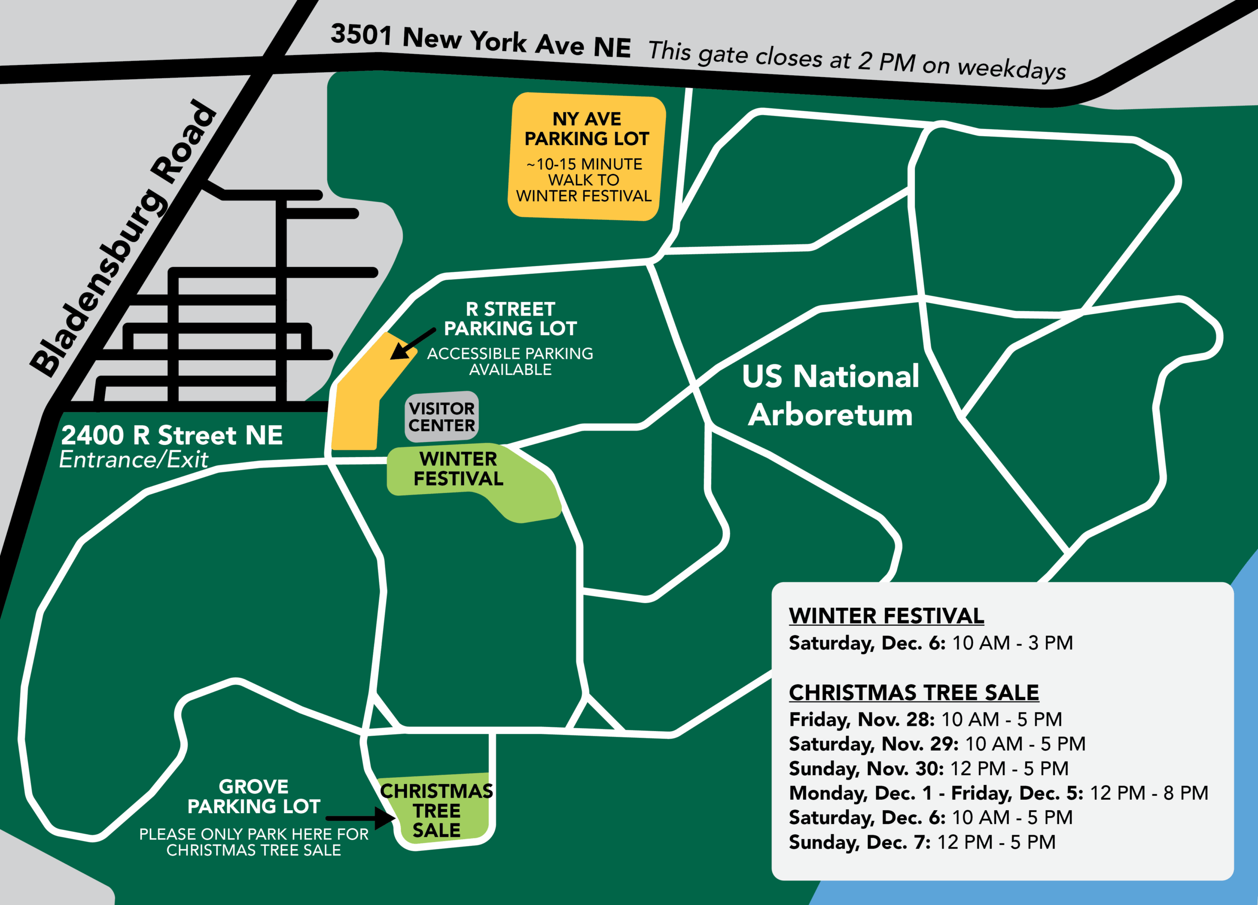 All Winter Festival activities will take place near the National Arboretum’s Visitor Center. However, the Christmas Tree Sale will take place in the Arboretum’s Grove parking lot, which is ~2 minute drive or 10 minute walk from the Visitor Center. Enter the Arboretum by either the R Street entrance (2400 R Street NE) or New York Avenue entrance (3501 New York Ave NE). Free parking is available at the Arboretum. See map below for details.